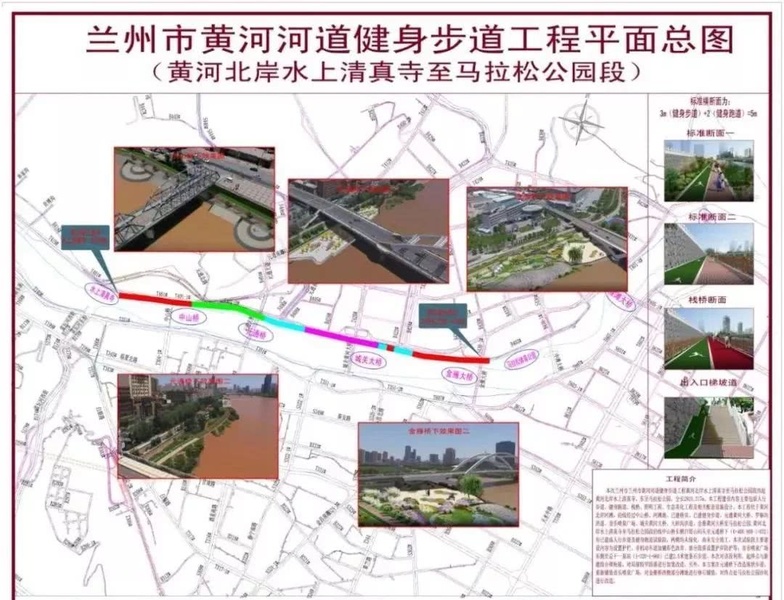 蘭州市黃河河道健身步道工程(黃河北岸水上清真寺至馬拉松公園段)位于黃河北岸河灘,全長(zhǎng)2924.317米,西起黃河北岸金城關(guān)古建一條街水上清真寺,沿途經(jīng)過中山橋、元通黃河大橋、羅鍋溝洪道、音樂噴泉廣場(chǎng)、城關(guān)黃河大橋、大砂溝洪道、金雁黃河大橋至馬拉松公園。主要建設(shè)內(nèi)容包括人行步道、健身跑道、棧橋、照明工程、生態(tài)美化工程、相關(guān)配套設(shè)施及中山橋、元通大橋、金雁大橋下和音樂噴泉廣場(chǎng)節(jié)點(diǎn)景觀改造。