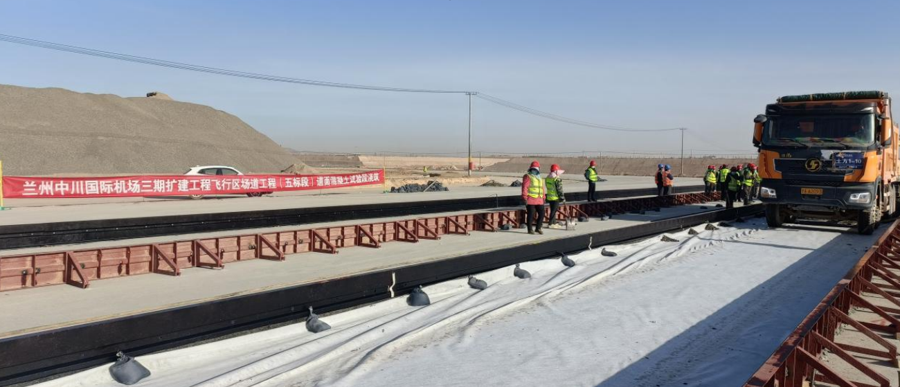 4月20日,由我司承建的蘭州中川國際機場三期擴建工程飛行區(qū)場道工程(五標(biāo)段)道面混凝土試驗段正式開倉澆筑。