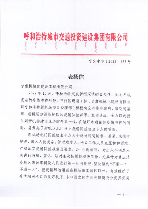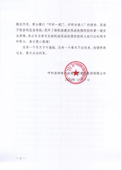 2022年12月7日,呼和浩特市交通投資建設(shè)集團(tuán)有限公司給我司發(fā)來表?yè)P(yáng)信,表?yè)P(yáng)信中充分肯定了我司呼和浩特新機(jī)場(chǎng)項(xiàng)目部在疫情防控工作上作出的努力,展現(xiàn)了我司的社會(huì)責(zé)任與擔(dān)當(dāng)。