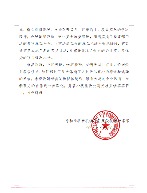 2023年9月28日,呼和浩特新機(jī)場項(xiàng)目建設(shè)現(xiàn)場指揮部給我司發(fā)來表揚(yáng)信,信中充分肯定了我司在呼和浩特新機(jī)場項(xiàng)目建設(shè)中項(xiàng)目部全體員工統(tǒng)一思想錨定目標(biāo)、精心組織管理、發(fā)揚(yáng)艱苦奮斗、迎難而上、攻堅(jiān)克難的鐵軍精神,合理調(diào)配資源、強(qiáng)化安全質(zhì)量管理,圓滿完成了指揮部下達(dá)的各項(xiàng)施工任務(wù)。