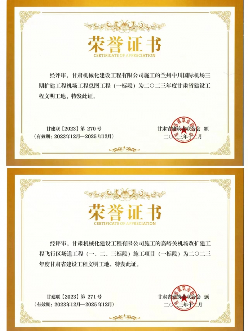 近日,我司承建的蘭州中川國際機(jī)場二期擴(kuò)建工程機(jī)場工程總圖工程 (一標(biāo)段)與嘉峪關(guān)機(jī)場改擴(kuò)建工飛行區(qū)場道(一、二、三標(biāo)段) 施工項(xiàng)目 (一標(biāo)段) 獲得2023年度甘肅省建設(shè)工程文明工地榮譽(yù)稱號。