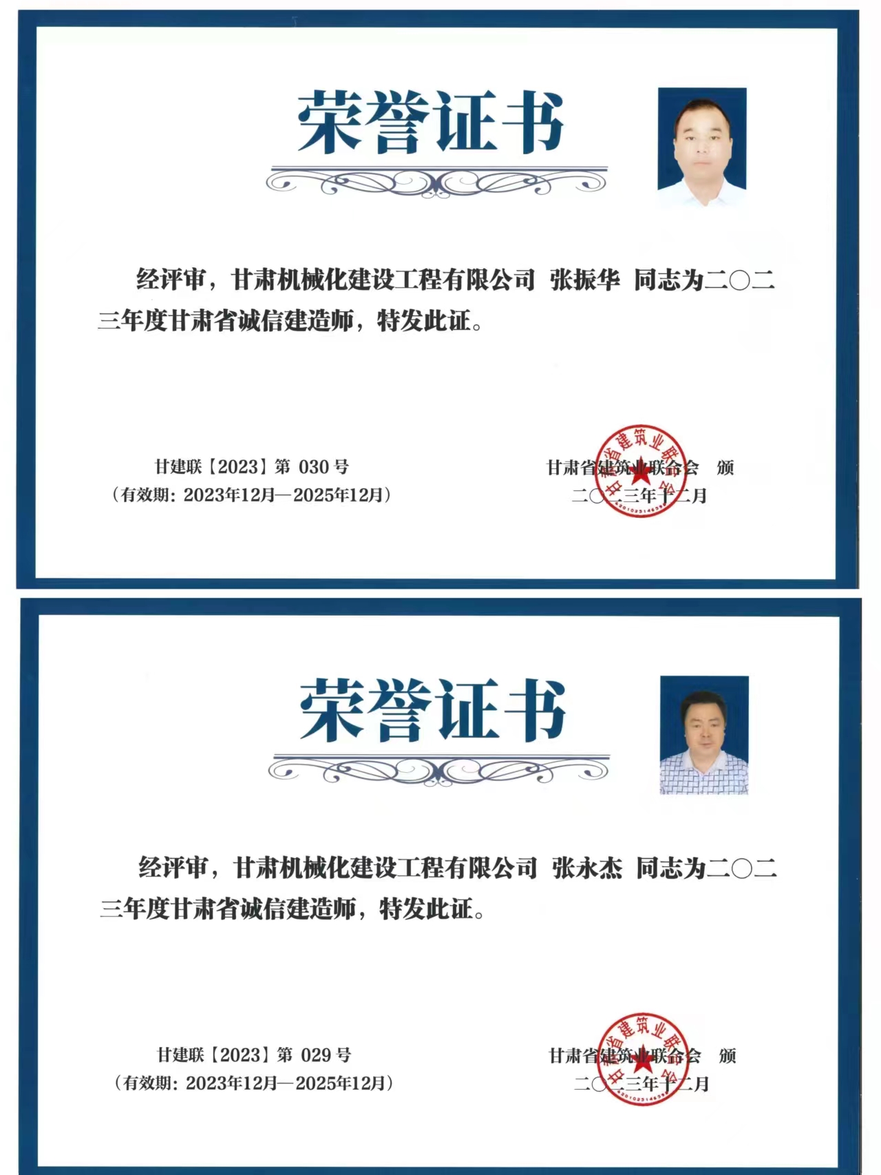 張永杰與張振華兩位同志獲得2023年度甘肅省誠信建造師榮譽(yù)稱號。