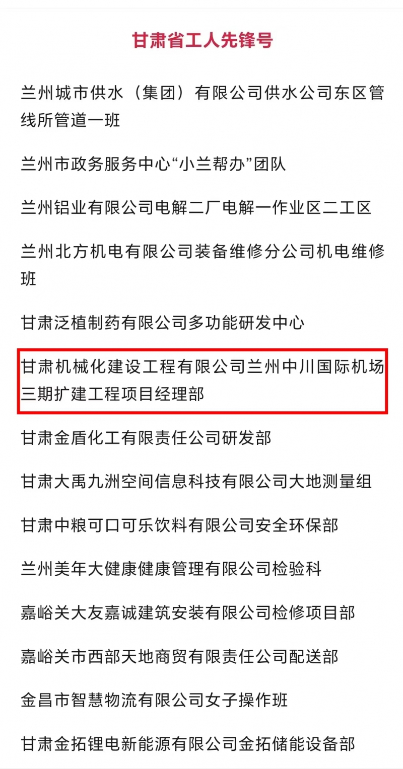 近日,甘肅省總工會發(fā)布了2024年甘肅省“五一勞動獎和甘肅省工人先鋒號”擬表彰對象的公示。我司蘭州中川國際機(jī)場三期擴(kuò)建工程項目經(jīng)理部被授予“甘肅省工人先鋒號”,該獎的獲得既是對項目團(tuán)隊長期拼搏奮斗的肯定,也是對公司“和諧共進(jìn)、追求卓越”企業(yè)精神的肯定。